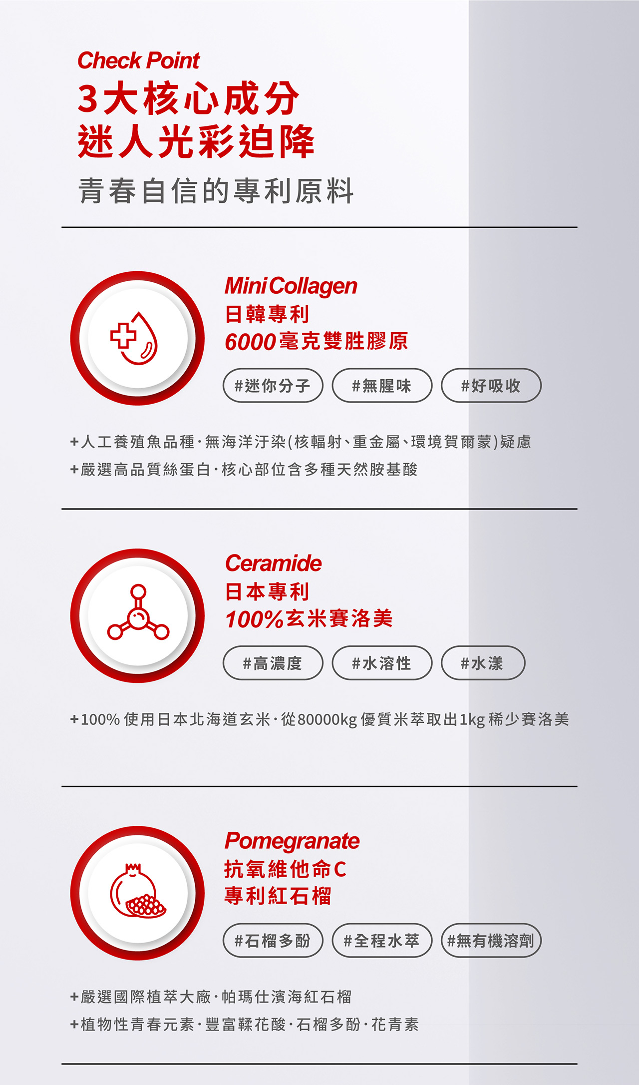 成份:水、魚膠原蛋白、蘋果濃縮汁、紅葡萄濃縮汁、石榴濃縮汁、澄清檸檬濃縮汁、檸檬酸、蠶絲蛋白、石榴萃取物、葡萄萃取物、葡萄籽萃取物、蒟蒻粉、山竹果抽出物、維生素C、玄米抽出物 詳見包裝。