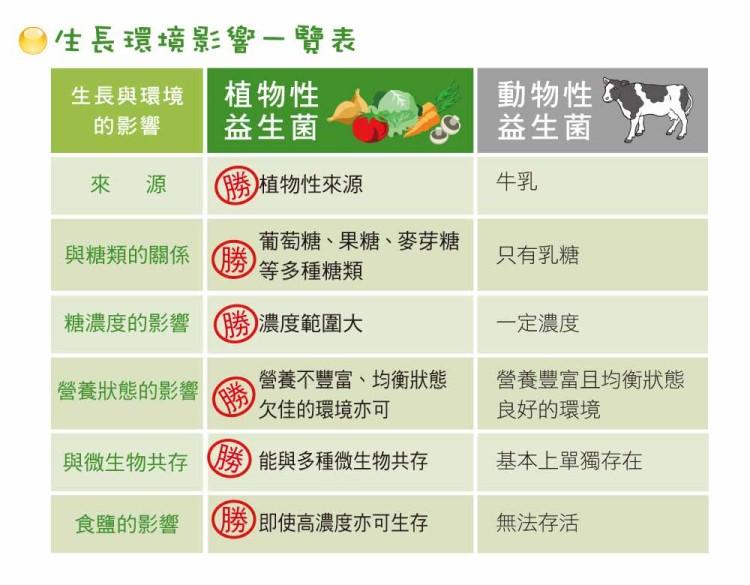 日本植物益生菌研究專家剛田早苗表示:因植物性益生菌生長環境惡劣,存活率較動物性益生菌高,更具有耐酸、耐膽鹽的特質,因此成為益生菌市場的新寵兒。