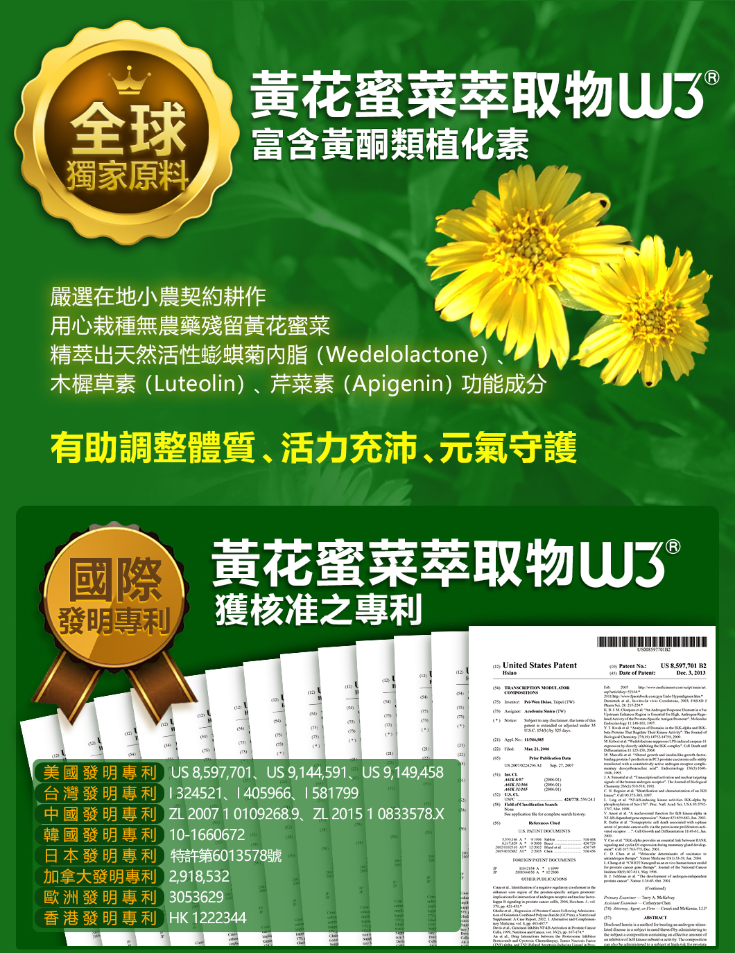 ★台灣最高研究機構專利技轉,完整保留黃花蜜菜萃取物W3®活性營養成分